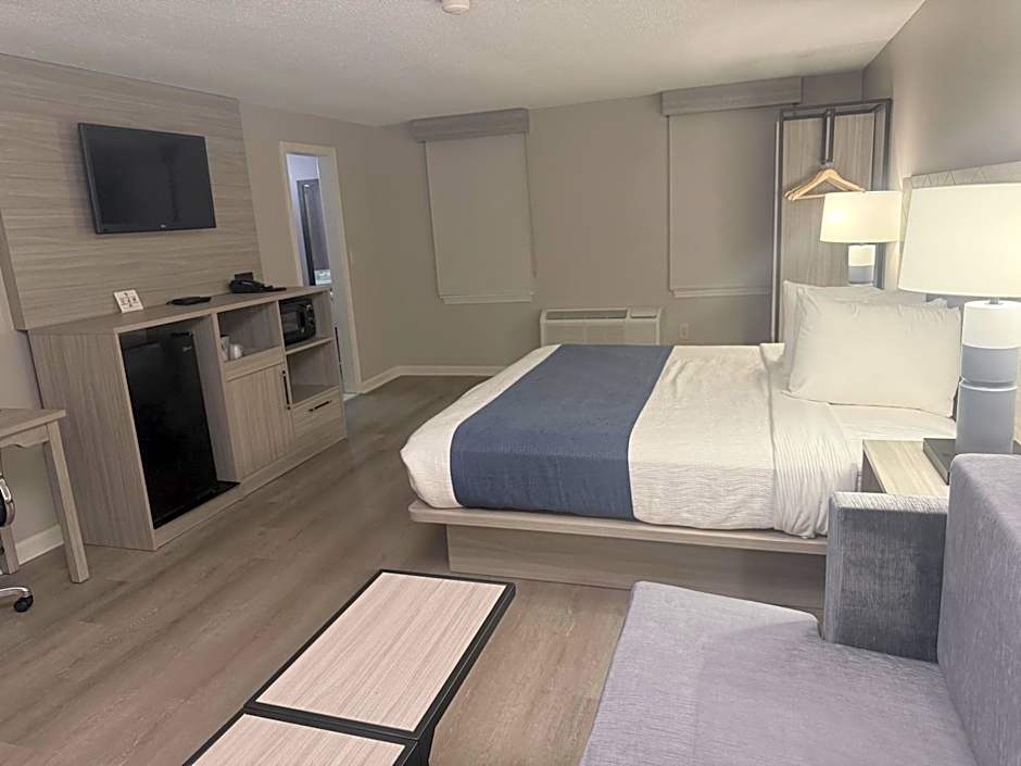 This room features a refrigerator, satellite TV, and a work desk.